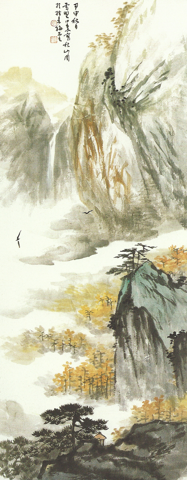 写《黄岳云峰》则用泼墨泼彩画西海的群山,用点虱法画出浩瀚的烟云,云海汹涌中的黄山群峰傲然,寓天地之精气,含山水之灵秀,浓重中透出淡泊,清新中显出刚毅,气势磅礴而又妩媚秀丽----此景只应天上有呵。至于九寨秋韵、匡庐飞瀑、黄河壶口、泰山岱顶、豫园春光、狮城街景、日本京都……都是他写生后创作的精品力作。